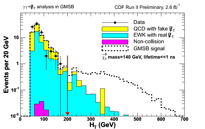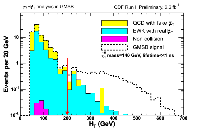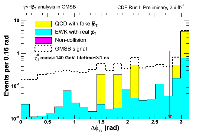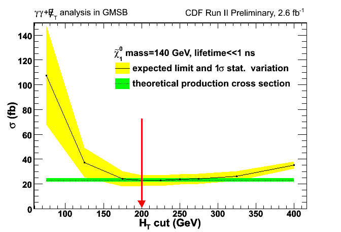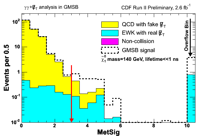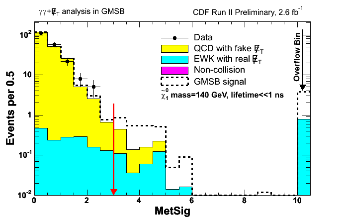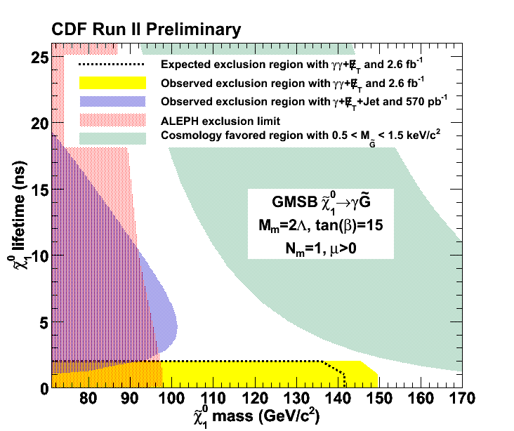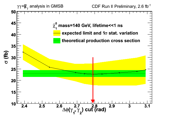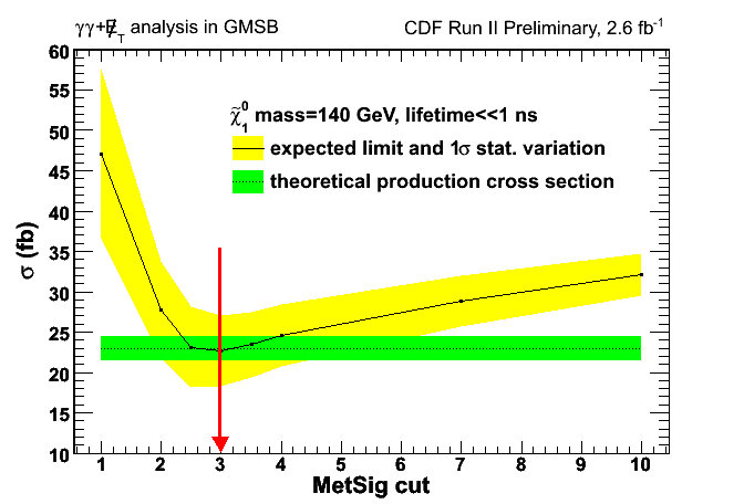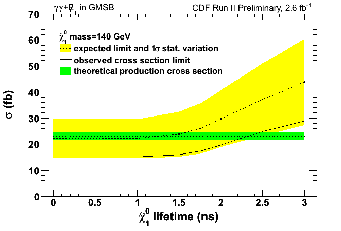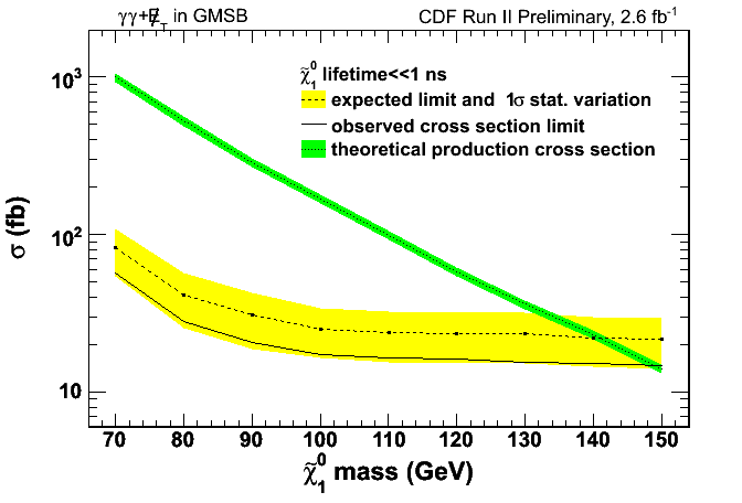 We present the results of an optimized search for a gauge mediated supersymmetry breaking model with &chi &rarr &gamma G with &tau(&chi )=0 ns in the &gamma&gamma+Met final state. We observed 0 event using 2.59 fb-1 of data collected by CDF II detector, which is consistent with the background estimate of 1.23± 0.38 events. We set cross section limits and mass limits as well as interpret our results for lifetimes up to 2 ns and find the exclusion region in the &chi lifetime vs. mass plane with a mass reach of 149 GeV/c2 at &tau(&chi )=0 ns. |