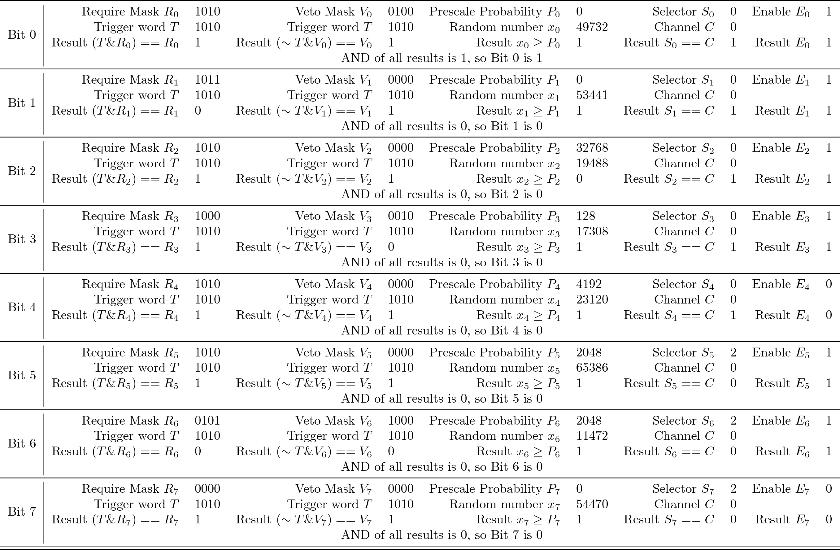 For the other bits, we simply specify why they aren't set to 1 (they fail to trigger). Bit 1 is 0 because one of the bits in the Require Mask (the last bit) is not present in the trigger word. Bit 2 is 0 because of the prescale. Bit 3 is 0 because one of the bits in the Veto Mask (the third bit) is present in the trigger word. Bit 4 is 0 because the Enable Bit is 0 (this trigger bit is disabled). Bit 5 is 0 because the channel number does not match the Selector (it is designed for a different channel). Bit 6 is 0 for multiple reasons: the required bits are not set in the trigger word, the vetoed bits are set in the trigger word, and the channel number does not match the Selector. Bit 7 is also 0 for multiple reasons: the channel number does not match the Selector, and the Enable Bit is 0. More detailed description (including data transfer information):Step-by-step: