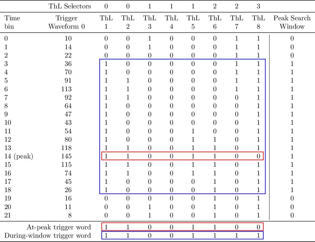 Figure 1: This figure shows the same input as used in the ThL design page with a pileup event for FIR 0. In this case only ThL 1 and ThL 2 are used for this trigger waveform. Note that the activation and deactivation lines are not used directly in the PS module, only the values of the ThL 1 and ThL 2 results, and the value of the trigger waveform which contains the information needed. Peak Search Window definitionThe peak search window is the time during which the trigger waveform is above the lowest of the associated thresholds described in the ThL module, where said association is defined by the Threshold Logic Selectors. In a little more detail, the Peak Search Window is defined using the 8 ThL bits received from the ThL module as well as the Threshold Logic Selectors described in the Configuration and Control Inputs. That is, for peak search submodule \(n\), Threshold Logic Selectors \(s_i\), and ThL bits \(t_i\), the peak search window is any contiguous block of time in which the following "peak search window bit" is TRUE: \[\operatorname*{OR}_{i=0}^{7} ((s_i == n) \operatorname{AND} t_i),\] where \(\operatorname*{OR}_{i=0}^{7}\) is the logical OR of all eight terms, and \(\operatorname{AND}\) is the logical AND operator. The peak search window begins when this expression becomes TRUE, and ends again when it becomes FALSE once again. Note that the "$t_0$" internal register will be set to the current timestamp at the moment the peak search window begins. Although the peak search window is not reported in the output, it is used to define the trigger primitives (peak amplitude, peak timestamp, and trigger word), which are described in the next section. Continuing the example from Figure 1, we assume that ThL Selectors 1 and 2 are set to this FIR input while all the other ThL Selectors are set to other FIR inputs. That is, this trigger waveform has only the two thresholds (and corresponding ThL bits) shown in Figure 1. Then, the peak search window for this submodule is defined by the logical OR of both of the two ThL bits. In Figure 1, ThL 2 has the value 1 during time bins 5-7 and again during time bins 13-16, and ThL 1 has the value 1 during time bins 3-18, and so the peak search window in this example extends from time bin 3 to time bin 18, inclusive. Construction of the trigger primitivesA set of trigger primitives consists of the peak amplitude, peak timestamp, and the trigger word, which records the status of the threshold logic bits during the peak search window and at the trigger waveform peak. Each PS submodule searches for the peak amplitude within its peak search window. It records the peak amplitude and the timestamp at which that peak amplitude occurred. These pieces of information for our example are shown in Figure 2 and Table 1. In our example, the peak amplitude is 145 and the peak timestamp is 14. Each submodule also constructs the trigger word based on the input threshold logic bits. The first 8 bits of the trigger word are just the values of the 8 threshold logic bits at the time of the peak. The second 8 bits of the trigger word indicate whether each threshold was exceeded at any time during the peak search window. More precise details of how each of these pieces of information is constructed are given below in the step-by-step description. Table 1 makes explicit, in our example, exactly how the trigger word is constructed. Note that, although the peak search window is defined only by ThL 1 and ThL 2 (due to the values of the threshold logic Selectors), all of the threshold logic bits play a role in determining the trigger word. In particular, ThL 1, 2, 5, and 6 are all 1 at the peak, in time bin 14, and so the first 8 bits of the trigger word are 11001100. Additionally, ThL 7 and 8 are both 1 at some point during the peak search window, while ThL 3 is only 1 outside the peak search window and ThL 4 is never 1 at all. So, the second 8 bits of the trigger word are 11001111. Once the peak search window ends, the peak amplitude, peak time, and trigger word are sent to the TrL module, which makes the L1 trigger decision and sends everything on to the L1 FIFO. Handling of saturated pulsesSome scattering events in our detectors are energetic enough that the transition edge sensors become fully normal conducting and remain so for some time. This produces a pulse that has a markedly different shape than lower-energy pulses, a "saturated pulse". The effect, from the trigger perspective, is that the trigger waveform will rise up to some maximum amplitude and then remain there, nearly flat, for an extended length of time. Such a flat-topped trigger waveform does not have a unique peak. The actual maximum amplitude will occur at some random point on this flat top (determined by the noise and the fine details of the pulse shape) rather than at the beginning of the flat top. Because of this, the "peak timestamp" reported by the PS module is unlikely be aligned in a consistent fashion with the rising edge of the pulse. This means that the L2 trigger will not be able to correctly align the readout window with the rising edge of the pulse. Luckily, for such a high-amplitude pulse, the time between the beginning of the peak search window (when the trigger waveform first rises above the lowest threshold) and the timestamp needed for correctly placing the readout window is more or less constant. In order to properly handle this case, the PS submodules have two additional configuration inputs. The first is a maximum length \(t_\text{max}\) for the peak search window. If the window is below this maximum length, then the pulse is treated as a normal pulse, but if the window is longer than \(t_\text{max}\) then the pulse is treated as a saturated pulse. The second configuration input is a timestamp offset \(\Delta t_\text{sat}\). When a saturated pulse is detected, then this offset \(\Delta t_\text{sat}\) is added to the timestamp at the beginning of the peak search window \(t_0\), and tha